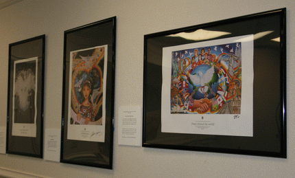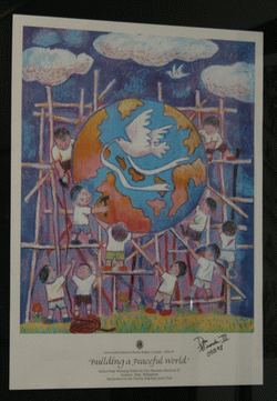 Winning peace contest posters from 1988-2007, representing winners from countries all over the world, are on currently on display. Established in 1988, the Lions International Peace Contest has attracted over 4,500,000 applicants ages 11-13. Each applicant has been sponsored by a Lions Club in his or her town or city. Lions Clubs enlist the help of schools, boys and girls community organizations, religious education leaders, and other organizations in finding applicants. All posters must be the work of the child who is the applicant. Posters must also conform in size and represent the theme chosen for that year. Entries are judges at the local, district, and multiple district levels before the grand prize winner and 23 runners up are chosen. Special recognition is given to the winners at all levels. At the presentation of the prize for the first contest in 1989, International President Austin Jennings said, “As an organization, Lions Clubs International believes that the pursuit of peace must include a recognition of the common dignity of all people in our world society. Peace is generated by understanding, tolerance, friend- ship and assistance based on the belief that people, despite differences in racial, ethnic or cultural heritage, share a common humanity. It is that effort - to foster understanding among the peoples of the world - that led us to sponsor this first International Peace Poster Contest. After all, there is not a better place to begin teaching understanding than among our children. Every child who enters this contest becomes an artistic peace ambassador in his or her own special way."